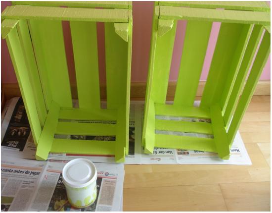 E, conforme prometido aqui, mostro-vos, também, o resultado da reciclagem de umas caixas de madeira. Aqui estão elas, depois da primeira demão de tinta.